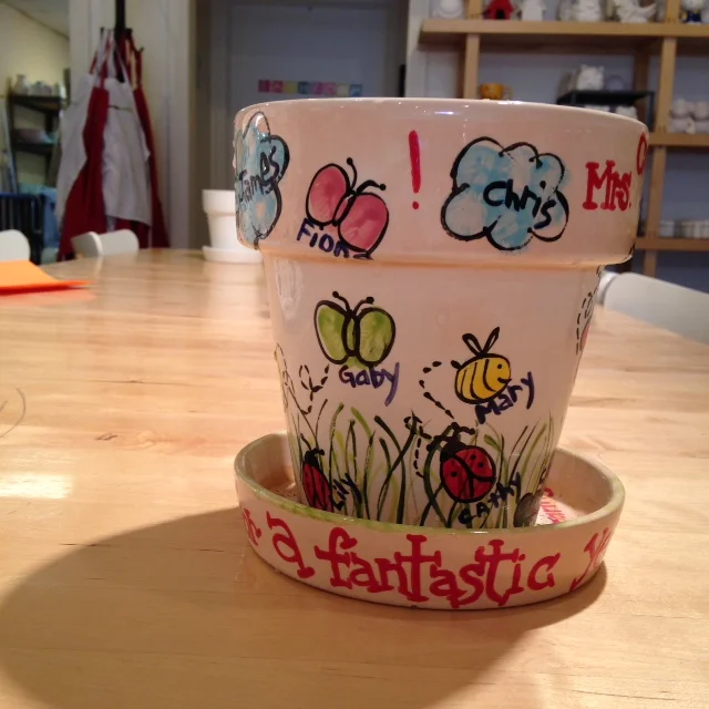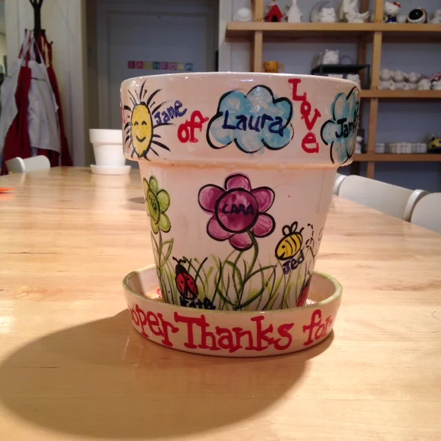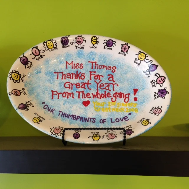 We specialize in platters with children's faces, thumbprints turned into creatures for flower pot and platter.
